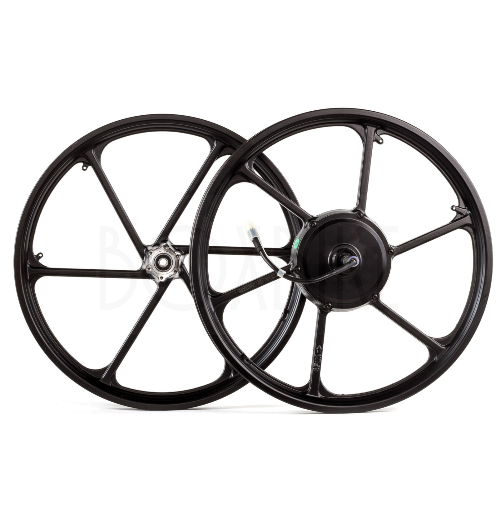 Fælgene er helstøbte alu/magnesiumfælge med kraftige eger, som klarer betydeligt mere vægt end almindelige små 20” hjul. Akselbredden er 100mm for og ca. 135mm bag, som er standard på de fleste af den type cykler. Hjulene bruges som standard på vores Strømstad flex og reflex foldecykler. Sættet kan også med fordel benyttes, hvis du vil opgradere en eksisterende elcykel, eller hvis du overvejer at bygge en foldecykel om til elcykel. Med disse kraftige og robuste hjul, undgå du helt problemer med knækkede eger, som ofte er en udfordring på små foldecykel med motor.