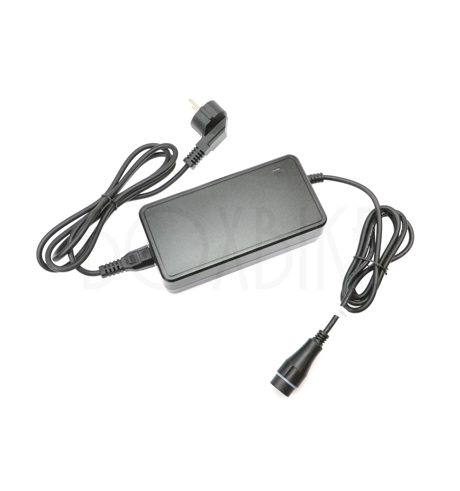 Opladeren har et standard 3-polet AC-stik, som passer til almindelige 220V stikkontakter. Opladeren er en såkaldt smartlader, hvilket indebærer den automatisk stopper opladningen når alle batteriets celler er opladet. Det sker for at undgå overladning som kan beskadige batteriet.