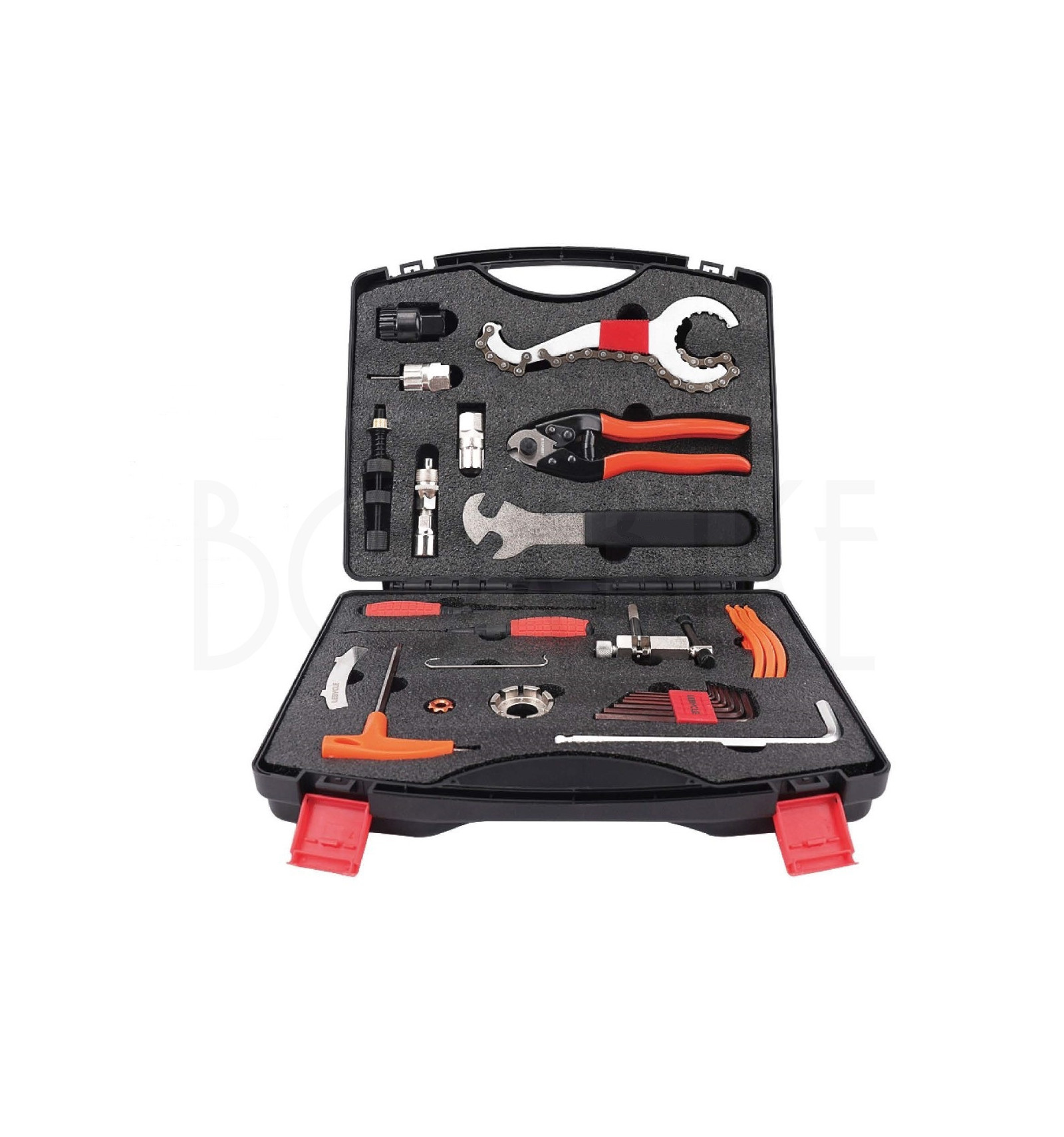 Praktisk verktygslåda för cykelreparationer som täcker de flestas behov. Setet innehåller 28 verktyg och passar oavsett om du behöver göra om din cykel till elcykel eller om du behöver underhålla en lådcykel.